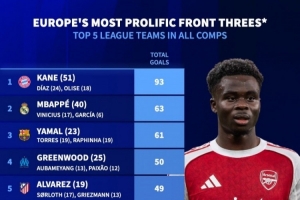 24直播网4月22日讯 《转会市场》统计了本赛季五大联赛各队三叉戟进球情况,拜仁断崖领跑、皇萨分列二三,阿森纳仅位列第13位。