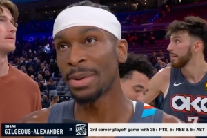 24直播网4月23日讯 今日NBA西部季后赛首轮G2,雷霆120-107拿下太阳,大比分2-0领先。赛后亚历山大在场边和发布会接受了媒体采访,以下为采访全文。