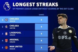24直播网4月23日讯 切尔西已经官宣罗塞尼尔下课,蓝军近期连续5场英超被零封连败显然是主要诱因。《转会市场》统计显示,这也是英超BIG6首次在联赛连续5场被零封+连败。