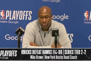 NBA直播网4月26日讯 NBA季后赛首轮G4,尼克斯114-98轻取老鹰,大比分战成2-2平。赛后迈克·布朗接受了媒体采访,以下为采访全文。