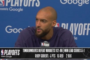NBA直播网4月26日讯 在今天结束的一场季后赛中,森林狼以112-96战胜掘金。赛后,森林狼球星鲁迪·戈贝尔出席了新闻发布会。以下是完整版采访内容。