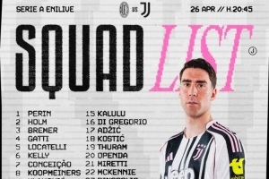 NBA直播网4月26日讯 北京时间明天凌晨,尤文将在意甲第34轮比赛中客场对阵米兰,尤文公布了此役的球员名单。佩林、弗拉霍维奇、阿季奇回归。