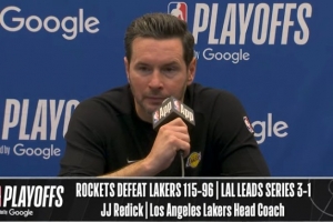 NBA直播网4月27日讯 NBA季后赛首轮G4,湖人96-115不敌火箭,系列赛大比分来到3-1。赛后JJ·雷迪克接受了媒体采访,以下为采访全文。