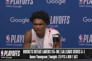 NBA直播网4月27日讯 在今天结束的一场季后赛中,火箭以115-96战胜湖人。赛后,火箭球员阿门·汤普森出席了新闻发布会。以下是完整版采访内容。