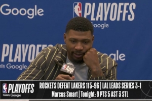 NBA直播网4月27日讯 在今天结束的一场季后赛中,湖人以96-115不敌火箭,大比分3-1领先。赛后,湖人球员马库斯·斯玛特出席了新闻发布会。以下是完整版采访内容。