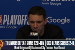 24直播网4月23日讯 今日NBA西部季后赛首轮G2,雷霆120-107拿下太阳,大比分2-0领先。赛后戴格诺特接受了媒体采访,以下为采访全文。