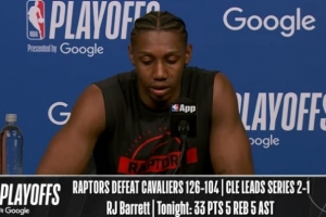 NBA直播网4月24日讯 季后赛G3,猛龙主场126-104大胜骑士,将大比分扳为1-2。赛后巴雷特接受了采访,以下为采访全文。