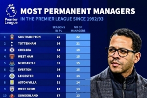 NBA直播网4月26日讯 德国转会市场统计了1992-1993赛季以来各队在英超经历的主帅人数,并列出榜单,南安普顿22人最多,热刺21人、切尔西19人。