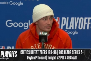 NBA直播网4月27日讯 NBA季后赛首轮G4,凯尔特人客场128-96大胜76人,总比分3-1拿到赛点。赛后普里查德接受了媒体采访,以下为采访全文。