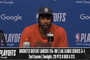 NBA直播网4月27日讯 火箭在主场以115-96击败湖人,将系列赛比分扳至1-3。赛后伊森接受了媒体采访,以下为采访全文。