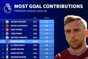 NBA直播网4月27日讯 德国转会市场统计了本赛季球员在英超的参与进球数量,并列出榜单,哈兰德31球居首,B费26球次席。