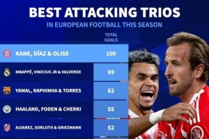 NBA直播网4月29日讯 拜仁在本轮欧冠客场4-5不敌巴黎,三叉戟各进一球。数据统计显示,拜仁三叉戟本赛季各项赛事总进球数是五大联赛各队三人组最多。