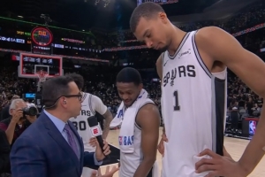 NBA直播网4月29日讯 首轮系列赛,马刺114-95轻取开拓者,大比分4-1绅士横扫。文班亚马和福克斯赛后在场边接受了媒体采访,以下为采访全文。